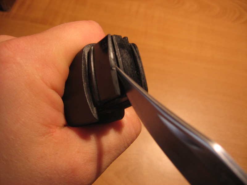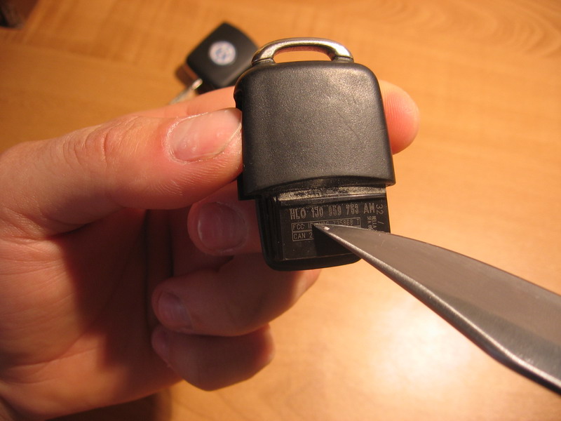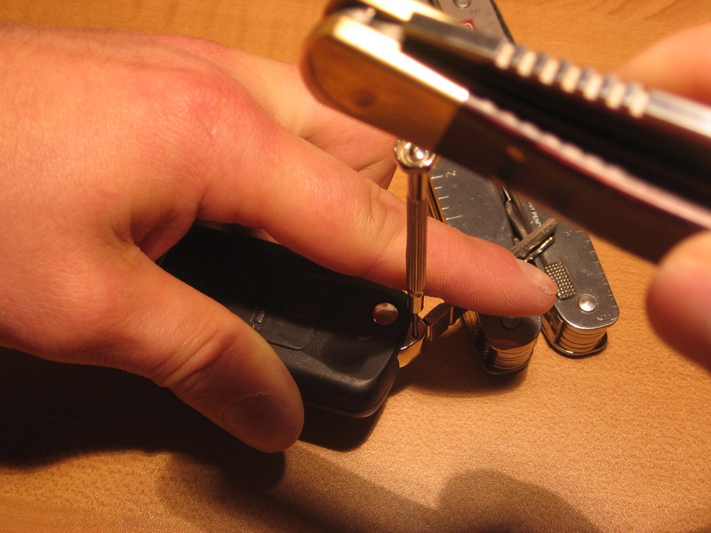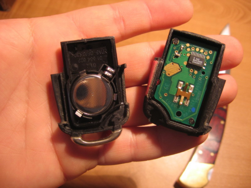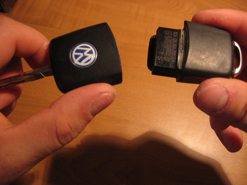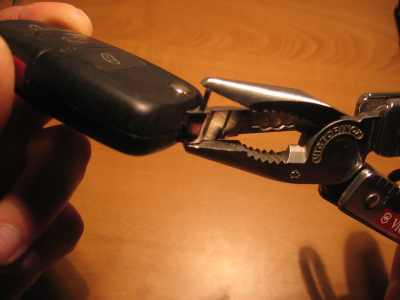 - сначала нужно разсоедить половинки брелка: подковыриваем чем-нить острым со стороны логотипа, тянем.